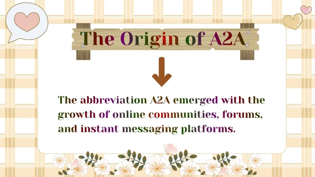 The abbreviation A2A emerged with the growth of online communities, forums, and instant messaging platforms. Initially popularized in Q&A websites, it has since spread to professional emails, texting, and social media. Its simplicity makes it ideal for fast communication.
